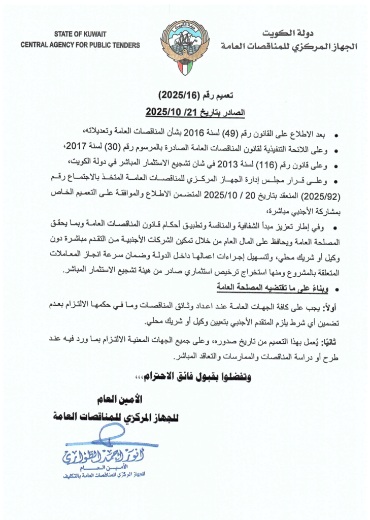 وإعمالاً لهذا التعديل التشريعي، أصدر الجهاز المركزي للمناقصات العامة التعميم رقم 16/2025 المؤرخ 21/10/2025 موجهاً كافة الجهات العامة إلى أنه عليها عدم تضمين وثائق المناقصات وما في حكمها أي شروط تلزم المتقدم الأجنبي بتعيين وكيل أو شريك محلي. ولقد جاء في التعميم أنه صدر في إطار تعزيز مبدأ الشفافية والمنافسة وتطبيق أحكام قانون المناقصات العامة – بتعديلاته- وبما يحقق المصلحة العامة ويحافظ على المال العام من خلال تمكين الشركات الأجنبية من التقدم مباشرة دون وكيل أو شريك محلي، ولتسهيل إجراءات أعمالها داخل الدولة وضمان سرعة إنجاز المعاملات المتعلقة بالمشروع ومنها استخراج ترخيص استثماري من هيئة تشجيع الاستثمار المباشر.