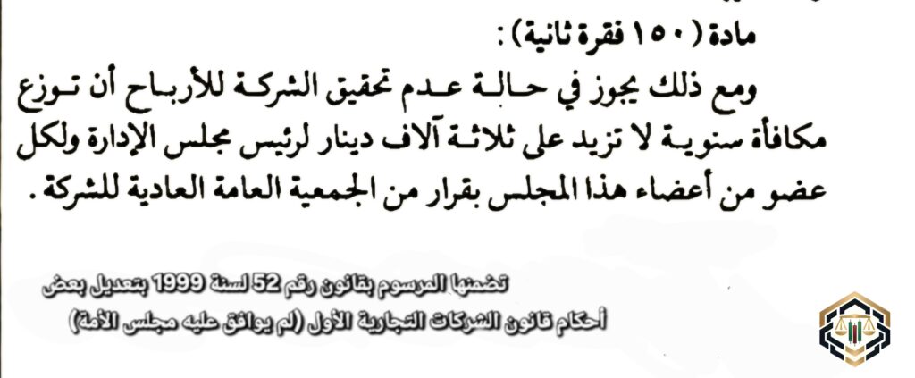ومع ذلك يجوز توزيع مكافأة سنوية لا تزيد على ستة آلاف دينار لرئيس مجلس الإدارة، ولكل عضو من أعضاء هذا المجلس من تاريخ تأسيس الشركة لحين تحقيق الأرباح التي تسمح لها بتوزيع المكافآت، وفقاً لما نصت عليه الفقرة السابقة. ويجوز بقرار يصدر من الجمعية العامة العادية للشركة استثناء عضو مجلس الإدارة المستقل من الحد الأعلى للمكافآت المذكورة.